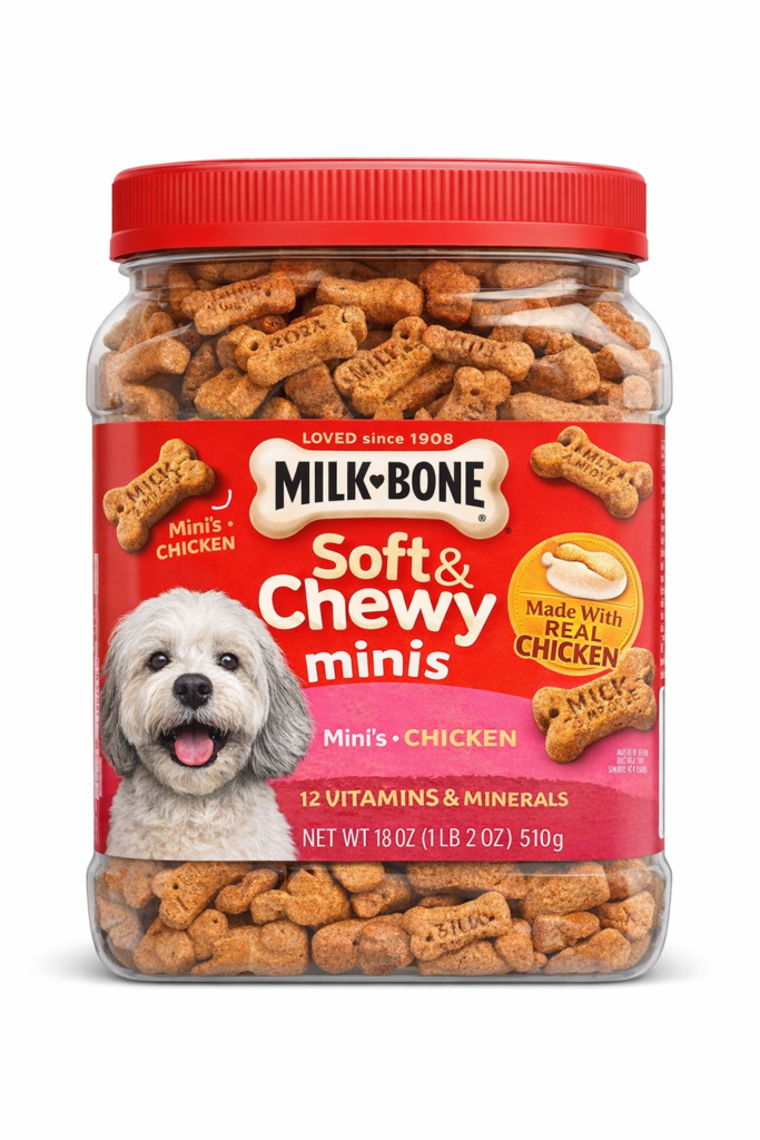 Milk – Bone Soft s Chewy Minis are delicious dite – sized treats made with real chicken, perfect for training and rewarding your dog. They are enriched with essential vitamins and minerals to support overall health while keeping your pet happy and active.