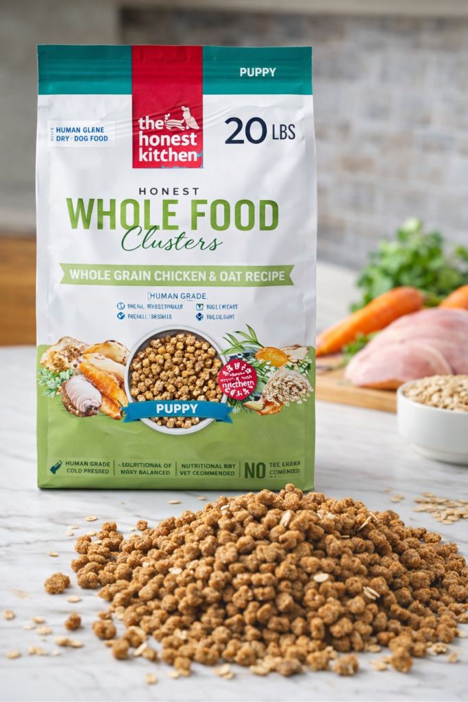 The The Honest Kitchen Human Grade Whole Food Clusters Puppy Blend Dry Dog Food is a premium dog food made with human-grade ingredients. This means the food is produced with the same quality standards as human food. The formula contains whole grains, chicken, oats, and vegetables to provide balanced nutrition for growing puppies.